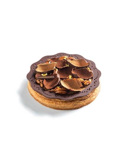 Dark chocolate décor, caramelized pecans, flowing praline, and buttery puff pastry.