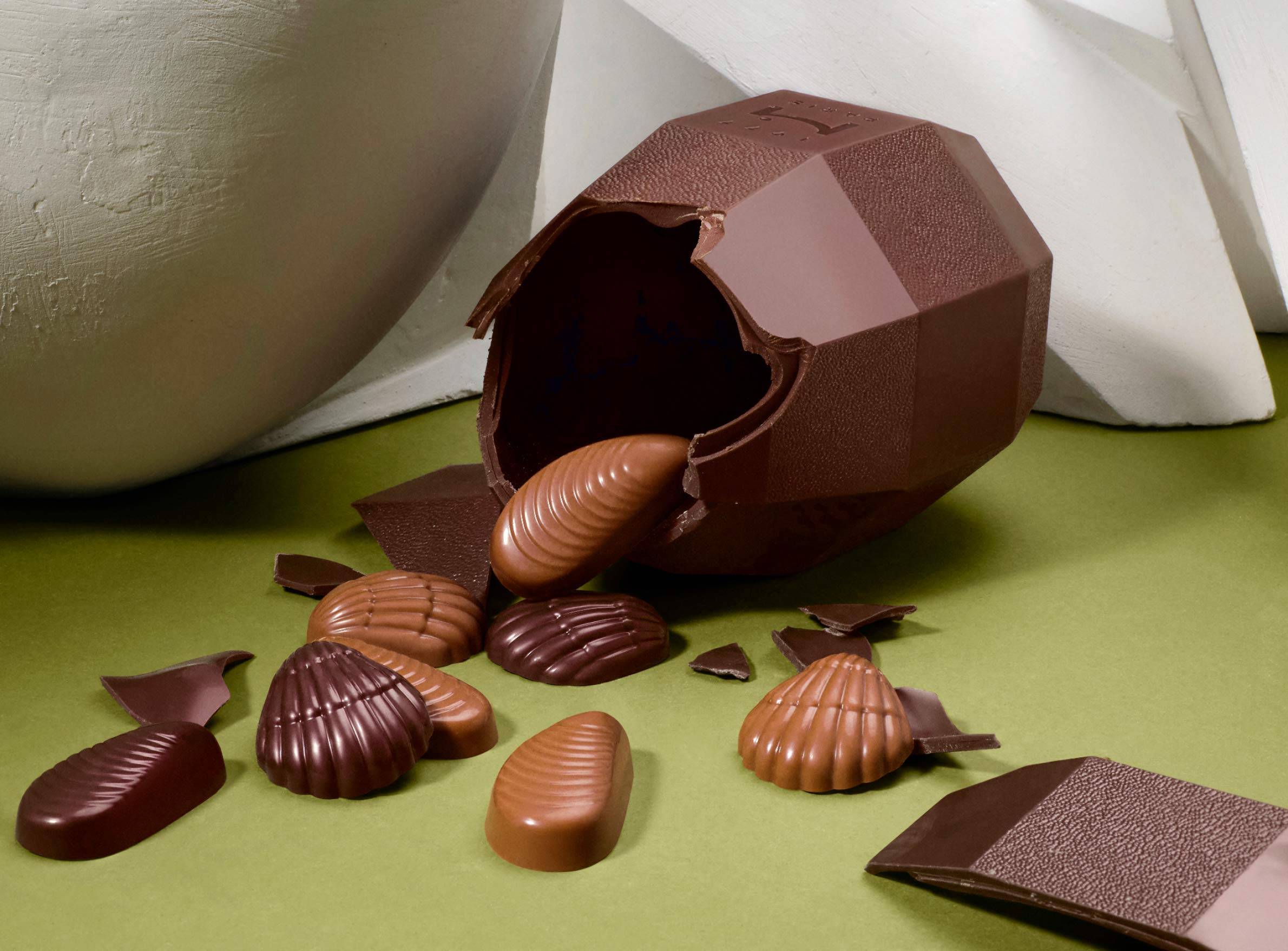 The Maison Eggs conceal an assortment of dark or milk chocolate seashells. A delicious invitation to savor the signature universe of La Maison du Chocolat.