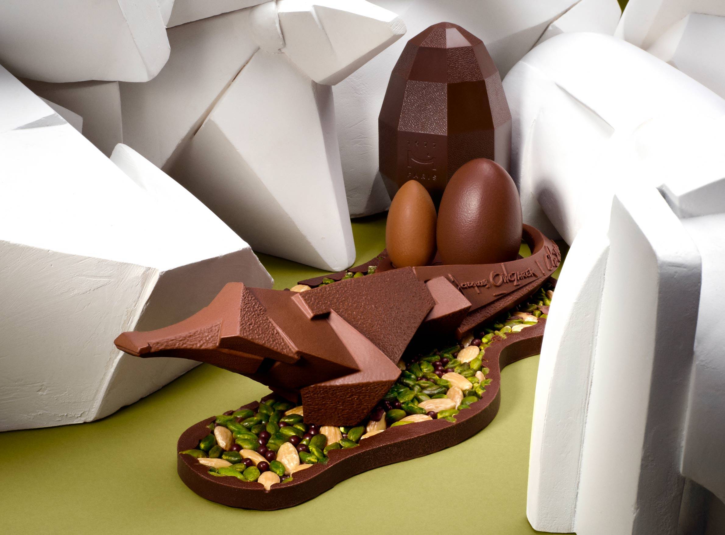 For Easter, Nicolas Cloiseau has chosen to invite animal sculptor Jacques Owczarek, joining forces in a four‑handed dialogue around material and volume. This collection celebrates vitality and energy through chocolate creations with expressive, dynamic lines.