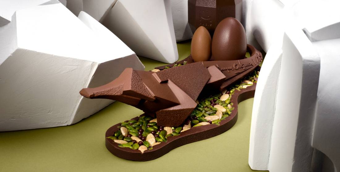 Venu bouleverser les lignes des tablettes habituelles, il taille dans l’énergie du goût. Dans son exercice de style, il s’affranchi des moules et donne un coup de frais immédiat. Six silhouettes longilignes empruntent chacune un caractère chocolat. Dans son intuition de cumuler les plaisirs, Nicolas Cloiseau mélange les genres. Un savant dosage de pure gourmandise et la promesse pointue d’une nouvelle collection qui revendique ses différences, à la fois riche, intense et totalement régressive à déguster par deux.