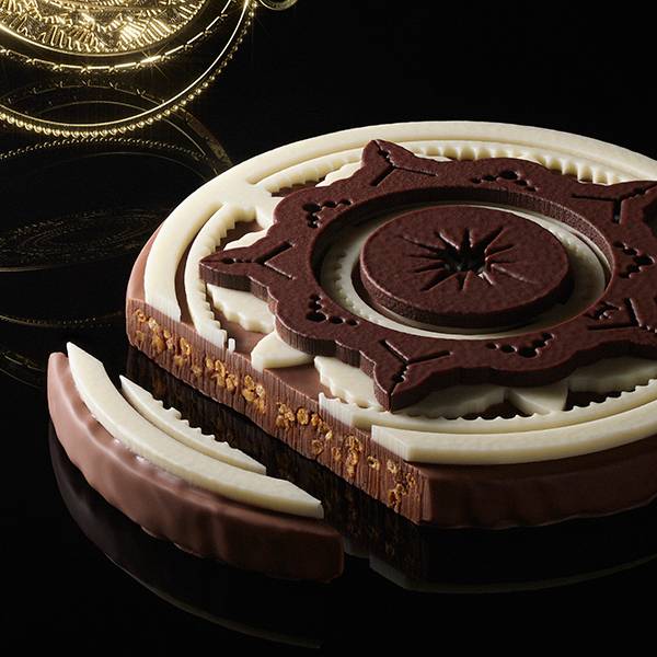 fondant aux éclats de fruits secs torréfiés et, en soutient discret, du riz soufflé pour la légèreté et le croustillant. Autour de cette architecture gourmande, quatre arceaux en chocolat s’offrent comme un décor.