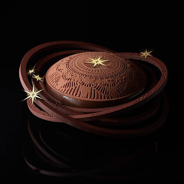 avec le vide. Tout en creux, en ajours et en dentelle, il joue avec l’air, capte la lumière et signe une silhouette sculpturale. Ici, le chocolat s’exprime en apesanteur. Percé, affiné, ouvert, chaque geste cisèle le chocolat comme on sculpte l’air. Un travail de précision, édifié comme un défi et pensé comme un geste haute couture. A sa cime, la pampille mobile qui le surmonte en ponctue l’élan, un ultime clin d’oeil à l’art du détail.
