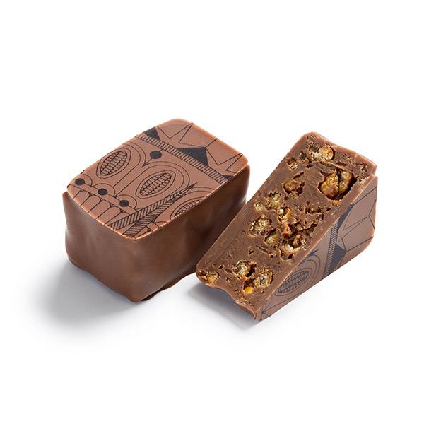 Bouchée de praliné amande/noisette aux éclats de riz brun japonais torréfiés, enrobée de chocolat au lait surplombée d’entrelacs de chocolats ouvragés en chocolat noir 56% et ivoire 33%.