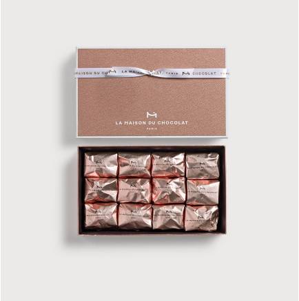 気品あるシャンバンゴールドの箱につややかなラウンド状のチョコレートが美しく並べられ、愛でる喜びも兼ね備えたコレクション、エフェルヴェソンス。丸い愛らしい姿はシャンパーニュの泡を連想させます。