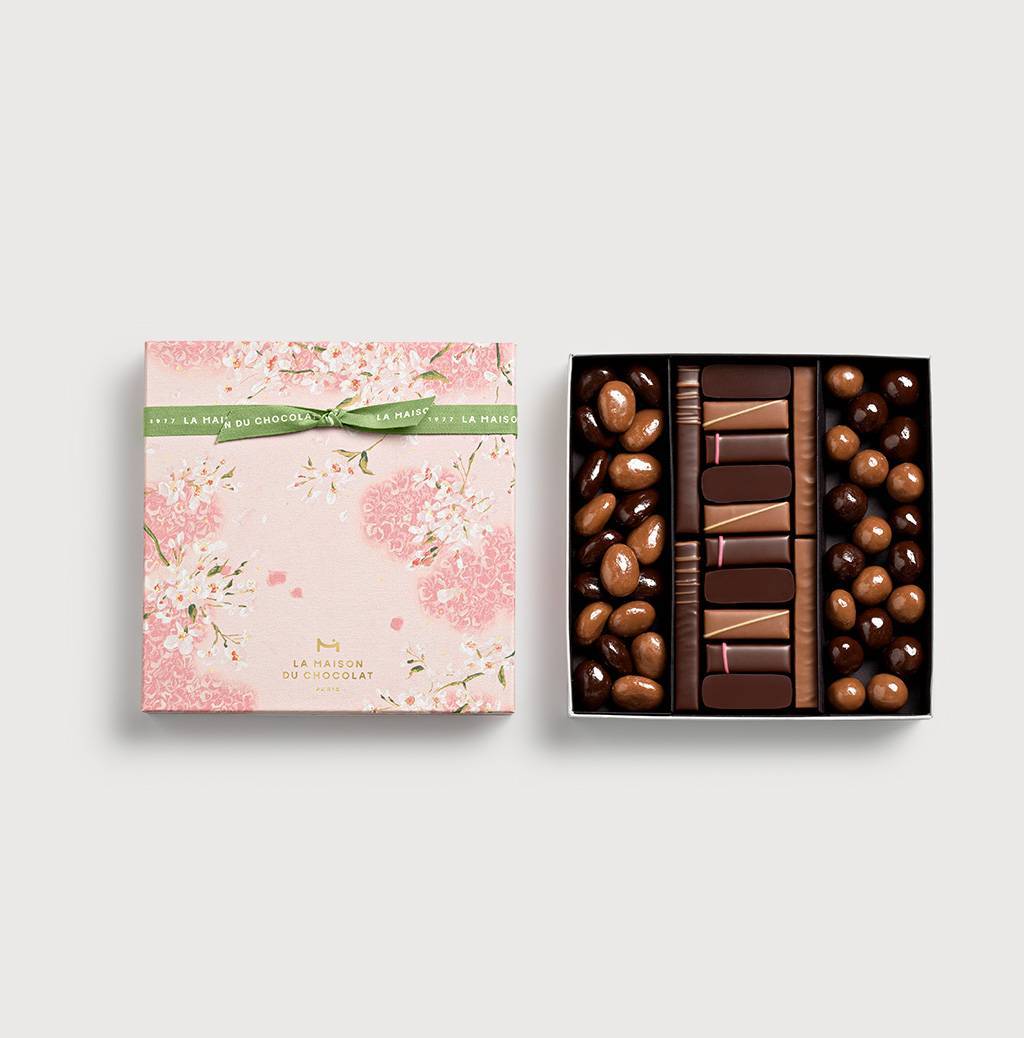 箱の中には爽やかなフルーティな味わいのガナッシュミルティーユと共に、ラ・メゾン・デュ・ショコラのクラフトマンシップを満喫いただけるガナッシュ、プラリネが並び、豊かなチョコレート時間をお楽しみいただけます。