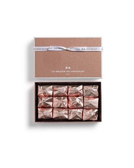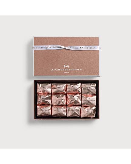 【季節限定商品】ブリュットとロゼ、2種のシャンパーニュ風味のガナッシュ。気品あるゴールドのパッケージに華やかな味わいのガナッシュが収められた目にも嬉しい、心浮き立つギフトボックスです。