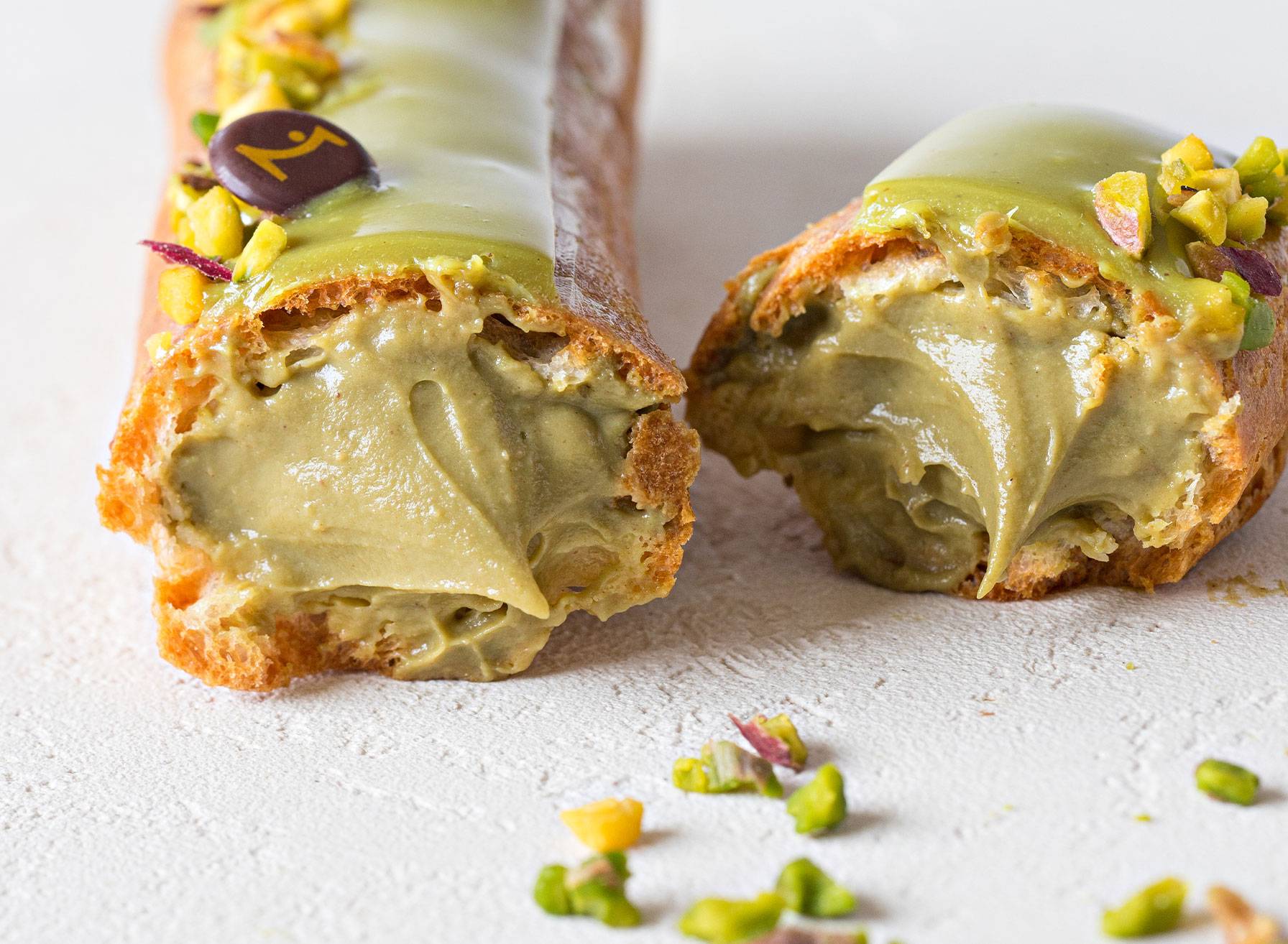 ピスタチオプラリネの濃厚なクリーム入りのエクレール。 ピスタチオ風味のグラサージュに細かく刻んだピスタチオのデコレーションが食感のアクセントとなった味わい。
