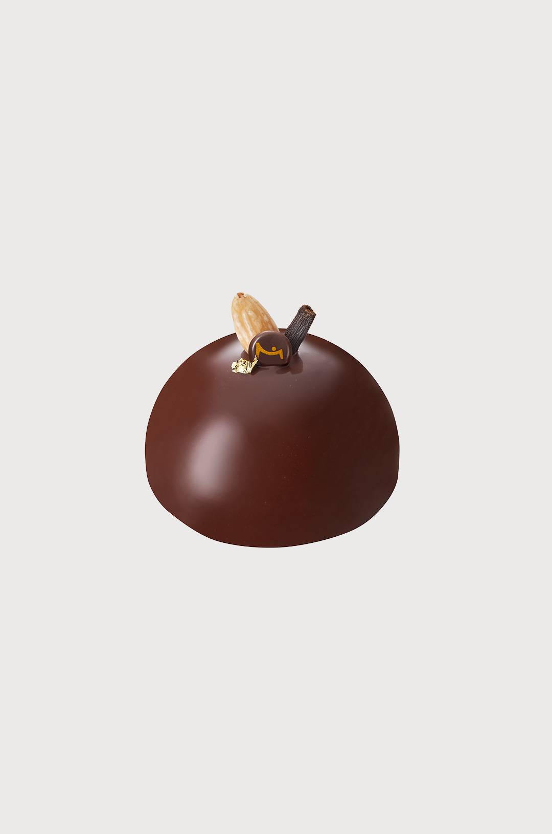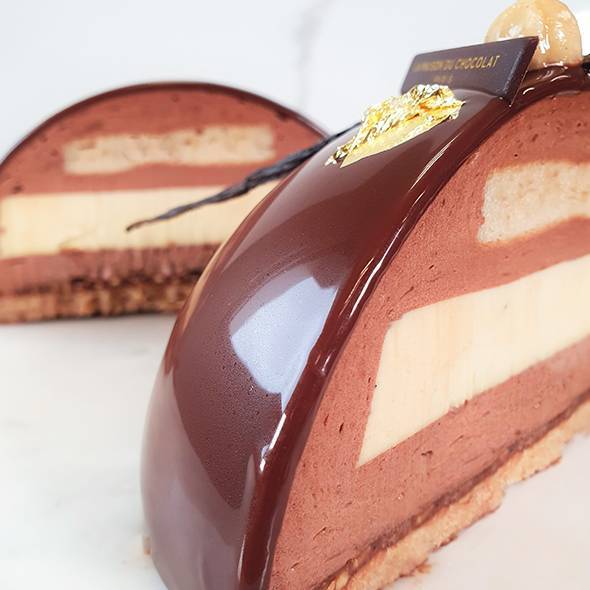 中にバニラクリーム(クレームブリュレ)を入れ、底にナッツのプラリネのビスキュイを使用したドーム型のケーキ。濃厚なチョコレートの味わいをお楽しみください。