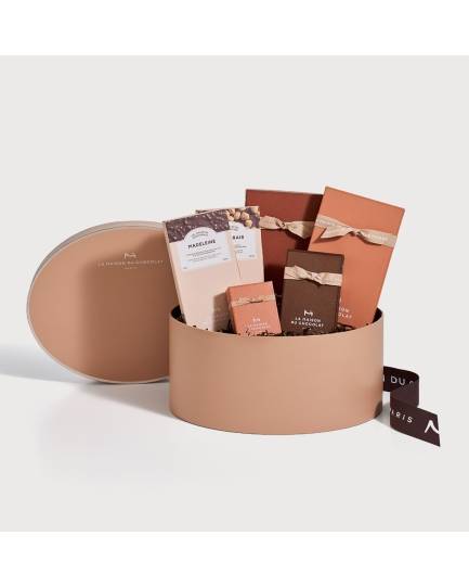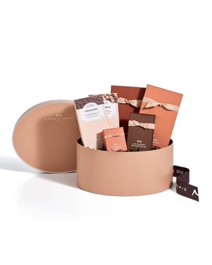 優しい色合いのレッドブラウンの円形ボックスにボワットに、ラ・メゾン・デュ・ショコラの定番チョコレートが詰めあわされた幸福感溢れるギフトセットです。