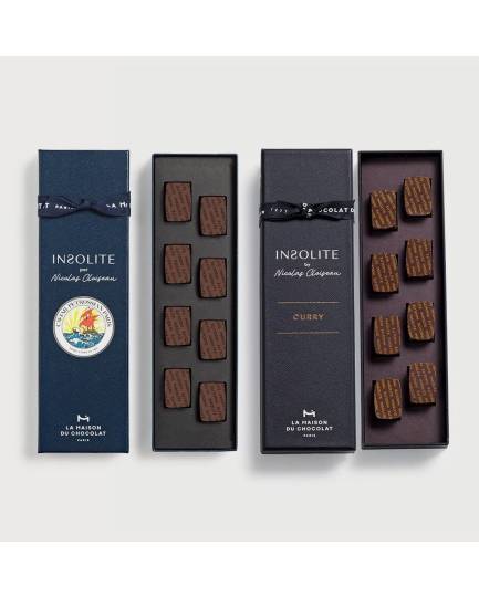 驚きの美味しさを味わう、アンソリット カレー。 インドカレーのスパイシーでまろやかな香り、そしてほんのりとした刺激とナッツの風味豊かなプラリネが醸し出すあじわいはまさに魅惑的なニュアンスに溢れています。 カカオバターとキャラメリゼされたナッツにスパイスを直接練り込むことで、インドカレースパイスの華やかな果実味が弾け、ナッツのカリカリした食感と共に絶妙なバランスをもたらします。