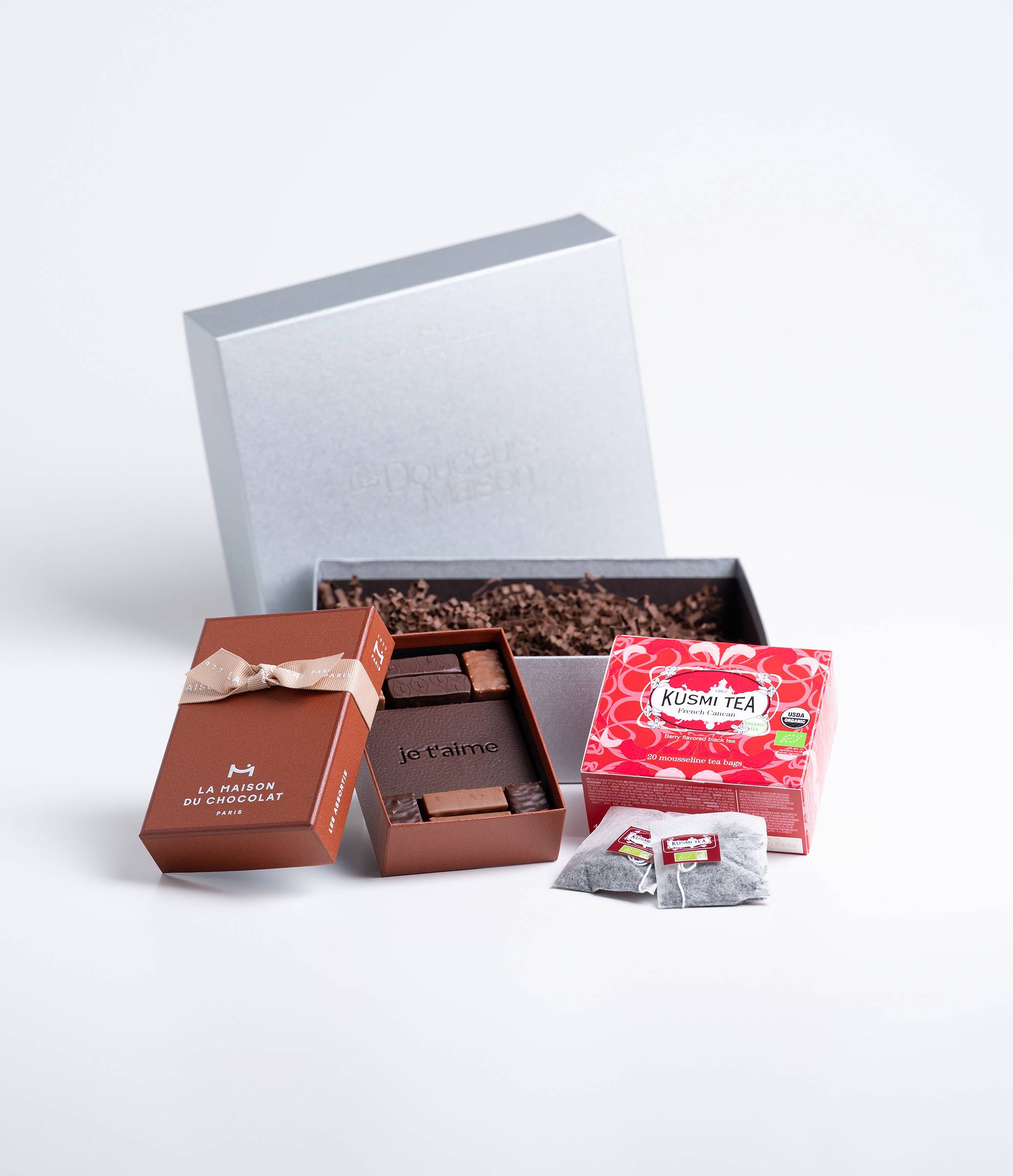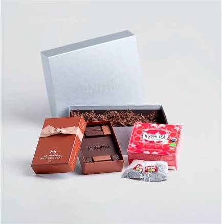 チョコレートに合わせ、クスミティーの愛に溢れるブラックティ-「フレンチカンカン」をセットにした愛に溢れるコラボレーション。イチゴやラズベリーなど、赤い実のフレッシュな果実感を感じるブラックティ-は、チョコレートと共にくつろぐ幸せ時間に華やかさを添えてくれます。