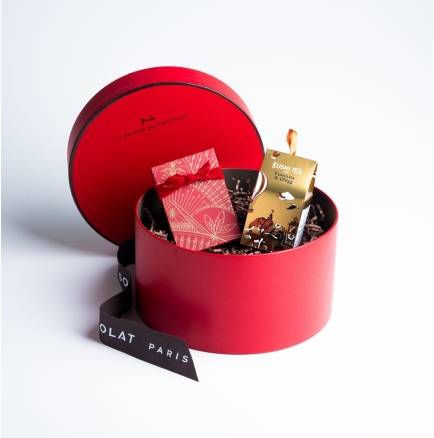 パリの街にきらめくオスマン建築やアイコニックな歴史的な建造物をモチーフに光り輝く永遠の都をイメージしています。 パリ彩る歴史的な建造物やカカオポッドや花のモチーフを美しい赤いボックスに祝祭のゴールドで描きました。 2種の限定レシピに加え、ラ・メゾン・デュ・ショコラの人気のアイコニックコレクションを詰め合わせたクリスマス限定ギフトボックスです。