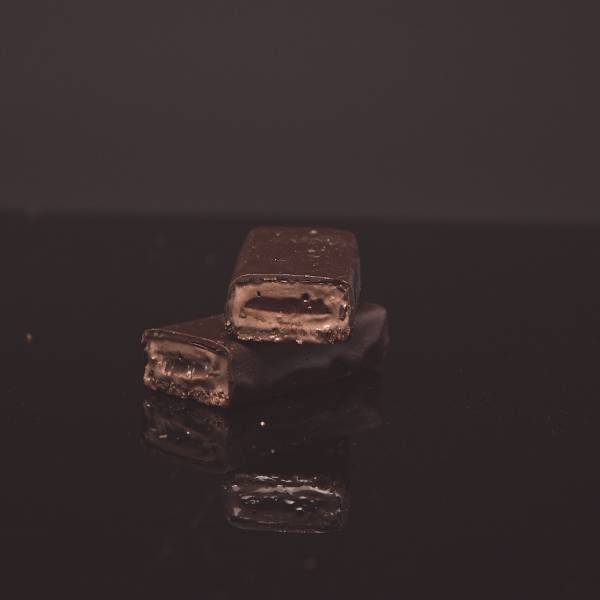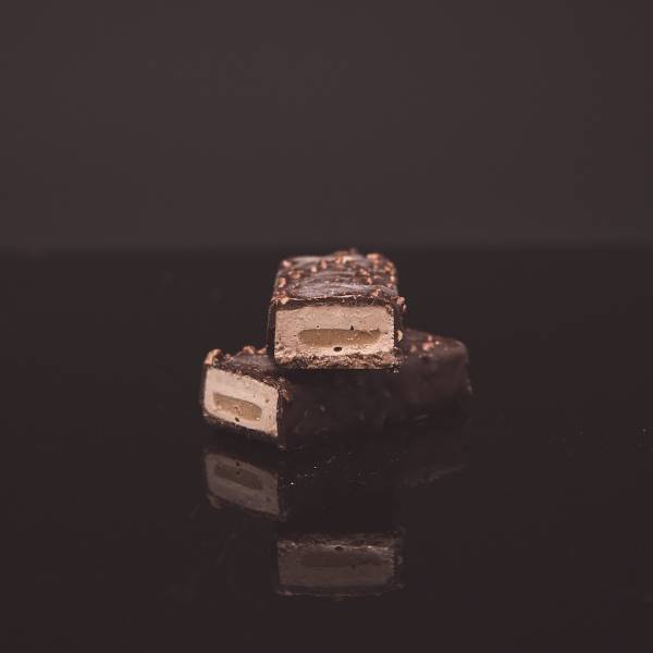 チョコレートとヘーゼルナッツのアイスに、バニラ香るキャラメルの心地よい甘さ。ローストノワゼットの粒を散りばめたビターショコラのコーティングが、濃密な味わいの層を生み出します。