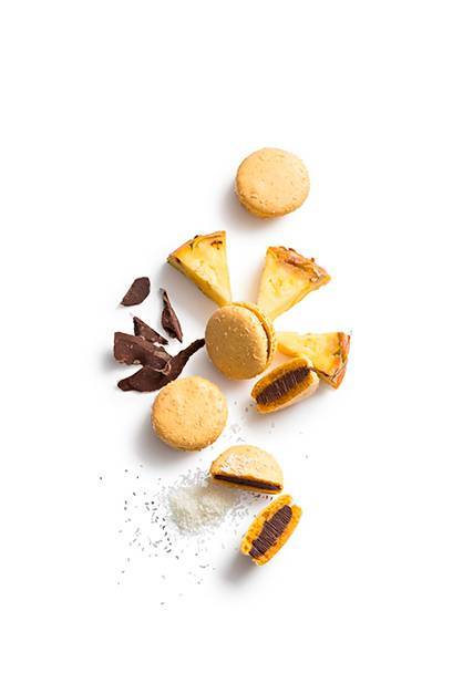パイナップルのピュレを混ぜたダークガナッシュ入りのマカロン