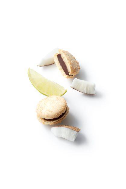 ローストしたココナッツをまぶした、ライムペーストとココナッツ風味のダークガナッシュ入り